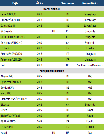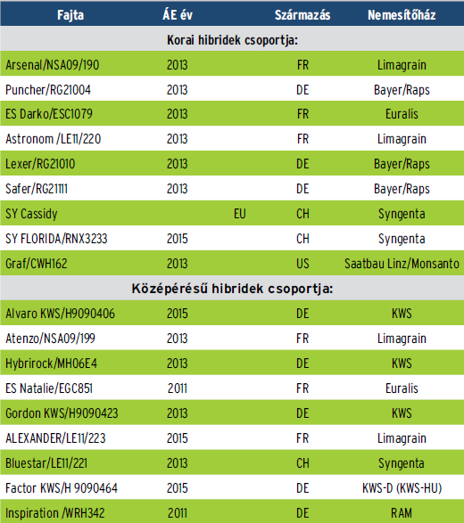 A NÉBIH a nemesítőházak megbízása alapján a 2016–2017. évi tenyészidőszakban korai éréscsoportban 10 hibridet, a középérésű csoportban szintén 11 hibridet vetett el 14, illetve 15 helyen az államilag elismert és EU-listás őszi káposztarepce hibridek kísérleti csoportjában. A vizsgáltban szereplő 21 hibrid közül 2 EU-listás, hazai nemesítésű repcehibrid nincs a kísérletben. A hibridek felsorolása a 2. táblázatban található.