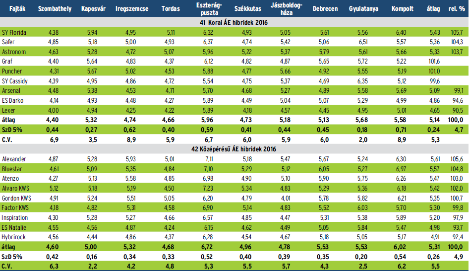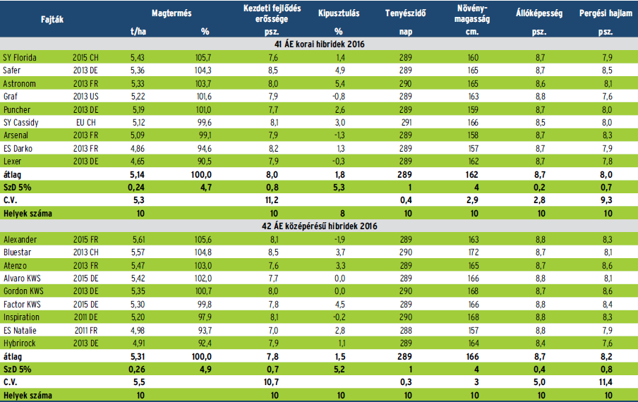 A NÉBIH a kisparcellás fajta-összehasonlító kísérletek értékelését 10 termőhelyen végezte el a nemesítőházak megbízása alapján. Kísérleti eredményt a korai éréscsoportban 9 hibridről, a középérésű csoportban szintén 9 hibridről közlünk (1. táblázat).