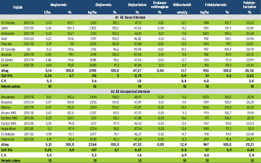 Mag-, fehérje- és olajtermés vonatkozásában a 2016. évi csoportátlag eredmények kedvezőbbek, mint a 2015-as év eredményei. A vizsgálatban szereplő hibridek esetében a glükozinolát- és olajtartalom-értékek is jobbak az előző év csoportátlag eredményeinél. A fehérjetartalom esetén azonban fordított a helyzet. A glükozinoláttartalom tekintetében a vizsgálatokban szereplő valamennyi fajtát 18 µmol/g-nál kedvezőbb értékek jellemezték az elmúlt két évben.