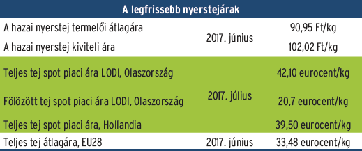 A tejtermelők helyzetét legtöbb esetben a nyerstej árának alakulása határozza meg. Július végén az EU28 és a hazai nyerstej átlagára között 3,3 eurocent/kg, átszámítva 10–11