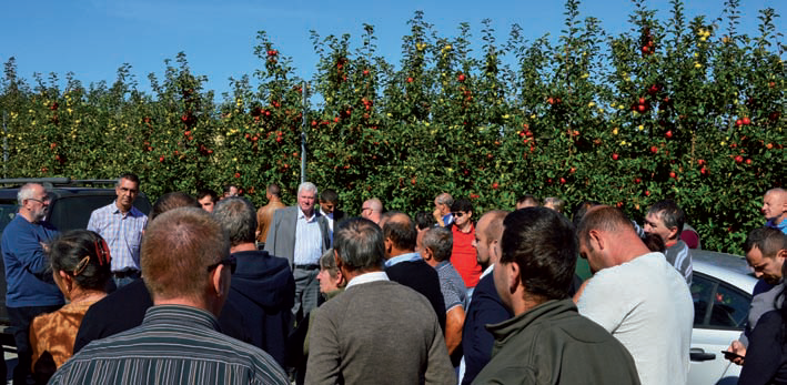Az elméleti részt gyakorlati fajtabemutató követte a Kiss B Ker Kft. Naturalma mintakertjében, ahol az érdeklődők a tervezettnél jóval több időt töltöttek el. A termés alatt roskadozó három- és négyéves fák mellett Kalydi Tamás szaktanácsadó szavait hallgatták érdeklődéssel, aki egy órán keresztül válaszolt a termelők kérdéseire. A gyakorlati bemutatót jó hangulatú késői ebéd és konzultáció követte.