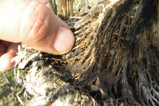 A hamuszürke hervadás (Macrophomina phaseolina) előfordulása, kártétele meleg időben, forró, száraz évjáratok esetében jelentős. Megjelenését követően a szár gyökérnyaki részén hamuszürke folt jelentkezik. A fertőzött növények kis méretű tányérokat növesztenek. A szár belsejében rengeteg mikroszklerócium képződik, amelyek segítségével a kórokozó sikeresen át is telel.