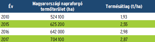 Magyarországon napraforgóból 2014-ben 1,56 millió, 2015-ben 1,53 millió tonnát takarítottak be. A 2016-os év a napraforgó-termesztés történetének új rekordját hozta: az 1,89 millió tonnás termésmennyiség mellett elért csaknem 3 tonnás (2,98 t/ha) hektáronkénti termésátlagot!