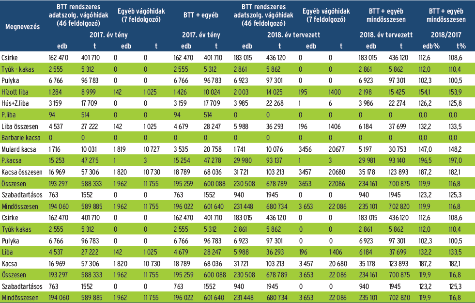 Az egy főre jutó hazai baromfihús-fogyasztásról különböző statisztikák látnak napvilágot. A BTT a belföldi értékesítést veszi alapul a fogyasztás méréséhez, ami 28,2 kilogramm baromfihúst jelent egy főre vetítve (2017). Tavaly e mennyiségnek 80 százaléka csirke, 11 százaléka pulyka, 6 százaléka kacsa, 2 százaléka liba és 1 százaléka tyúk volt. Meg kell jegyezni, hogy a tavalyi év a fogyasztás szempontjából sem tekinthető „normális” évnek, hiszen a madárinfluenza járvány miatt közel fél évig nem lehetett kapni kacsát és libát, ami nyilván negatívan befolyásolta a fogyasztást. Szintén fontos megjegyezni, hogy a tényleges baromfihús-fogyasztás ennek mintegy másfélszerese, hiszen számos készítményben eszünk baromfihúst, mint például felvágottakban, a mirelit és panírozott termékekben, de kalkulálni kell a közétkeztetéssel, az éttermi fogyasztással, sőt az importtal is.