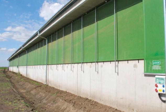 A nyitott oldalfalú istállóknál a huzat mérséklésére és a rovarinvázió ellen általában kétféle megoldás terjed: fényáteresztő panelek, amelyeknél a légbevezetés mértékét a nyílás mértékével lehet változtatni, de lehet szőtt légáteresztő vagy zárt fóliát alkalmazni, amelyek függönyszerűen nyithatók és zárhatók. A légáteresztő háló (fólia) alkalmazása igen előnyösnek bizonyul, mivel a friss levegőt átengedi, de kizárja rovarokat, miközben biztosítja az épület huzatmentességét is. A viszonylag sűrű és apró nyílások mögött nem alakulhat ki nagy, az állatokat zavaró légsebesség. A legtöbb megoldásnál a nyílások mértéke, rendszerint a magasság állításával, a függönyök villanymotoros működtetésével végezhető (1. ábra).