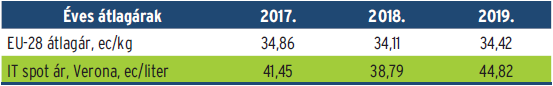 Az EU súlyozott nyerstej átlagára dinamikus második félévi javulással év végére 35,51 eurocent/kg szintet ért el. Ez az ár gyakorlatilag megegyezik az egy évvel korábbival. A tejár Szlovéniában (+5 százalék), Magyarországon és Olaszországban (egyaránt 6 százalék) emelkedett a legnagyobb mértékben egy év alatt. Dániában 12 hónap alatt 10 százalékos a visszaesés, de 5 százalék fölötti tejárcsökkenést mértek Írországban, Németországban, Svédországban és Hollandiában is. Továbbra is Cipruson, Máltán és Finnországban a legdrágább a nyerstej, míg a balti államokban a legolcsóbb ez a termék. A külföldi eredetű olasz spot tejek ára továbbra is magas. A decemberi 23,65 eurocent/kg fölözött tejár 33 százalékkal magasabb az egy évvel korábbi árnál. Az éves, 44,17 eurocent/liter – külföldi eredetű teljes spot – tej átlagára (Milánó) 11 százalékkal magasabb a 2018. évi átlagárnál (1. táblázat).
