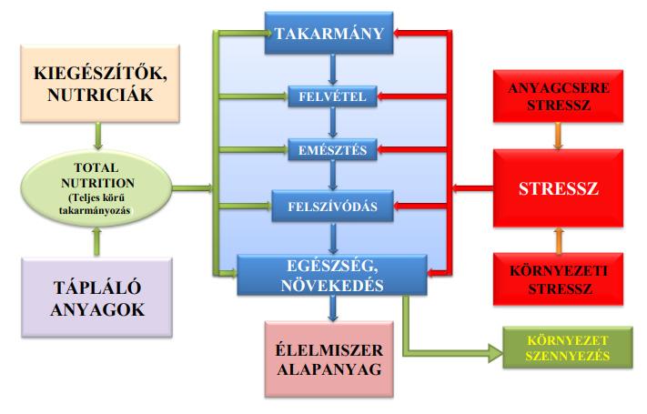 Az alábbi ábrán látható, ahogy az állatok által felvett táplálóanyagok és nutriciák az anyagcsere-folyamatok során fokozatosan átalakulnak állati eredetű termékké. Az átalakítás hatékonysága azonban nagymértékben függ a különböző stresszfaktoroktól.