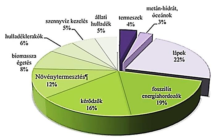 2. ábra. Napjainkban jó közelítéssel a légkörbe kerülő metán megoszlása [5]