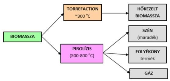 3. ábra. A biomassza hőbontása (pirolizálás) módszerei és termékei [1]