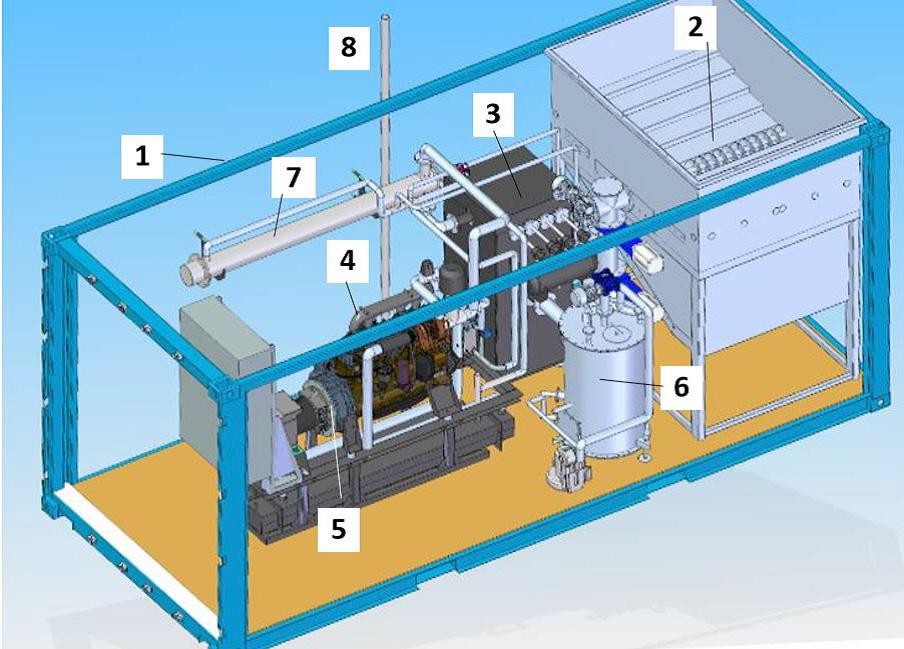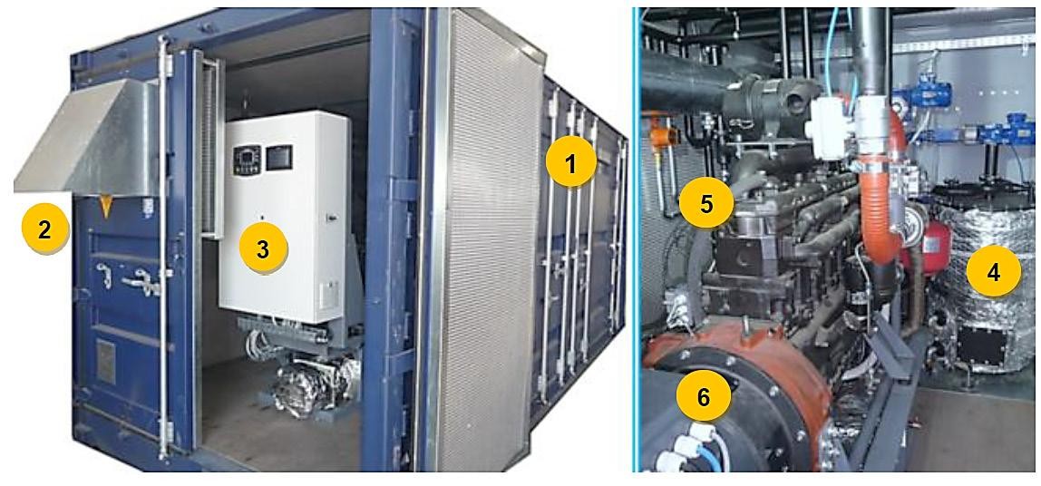 6. ábra. A konténer (1) a vezérlővel (3) és a gázmotoros generátorral (5, 6)