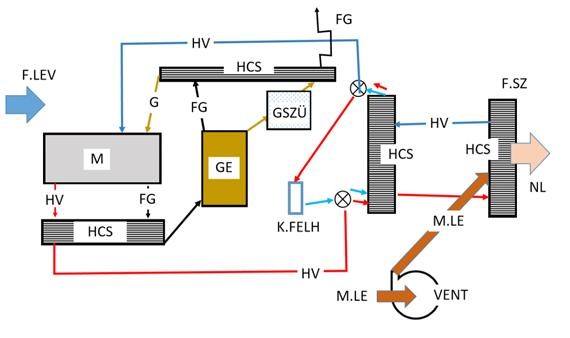 HCS – hőcserélő, FG – füstgáz, GE – gázgenerátor, G – gáz, K.FELH – külső