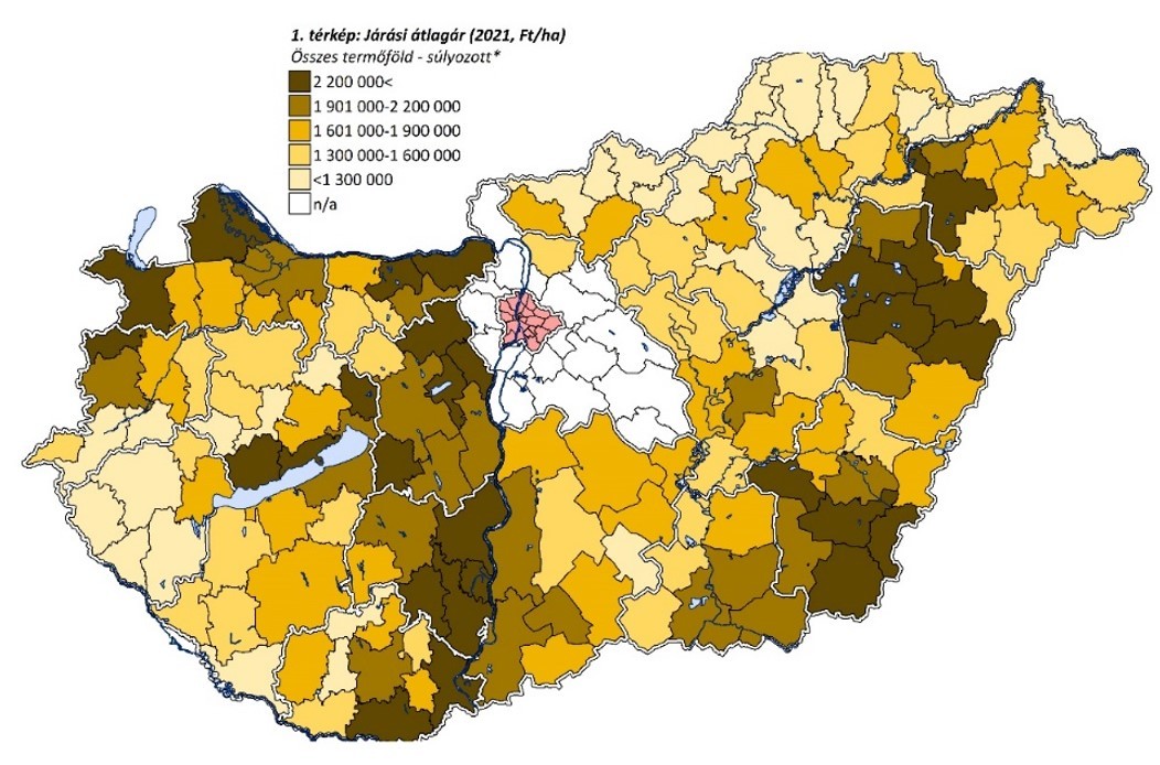 „A legdrágább megye 2021-ben Békés lett 2,36 millió forintos hektárárral. Ezen kívül Hajdú-Bihar, Tolna, Fejér és Győr-Moson-Sopron megye lépte át a kétmilliós szintet. Tavaly Nógrád először mozdult el az árlista utolsó helyéről, átadva azt Borsod-Abaúj-Zemplén megyének, ahol 1,23 milliós átlagos hektárárat láthattunk” – mondta Valkó Dávid, az OTP Jelzálogbank vezető elemzője.