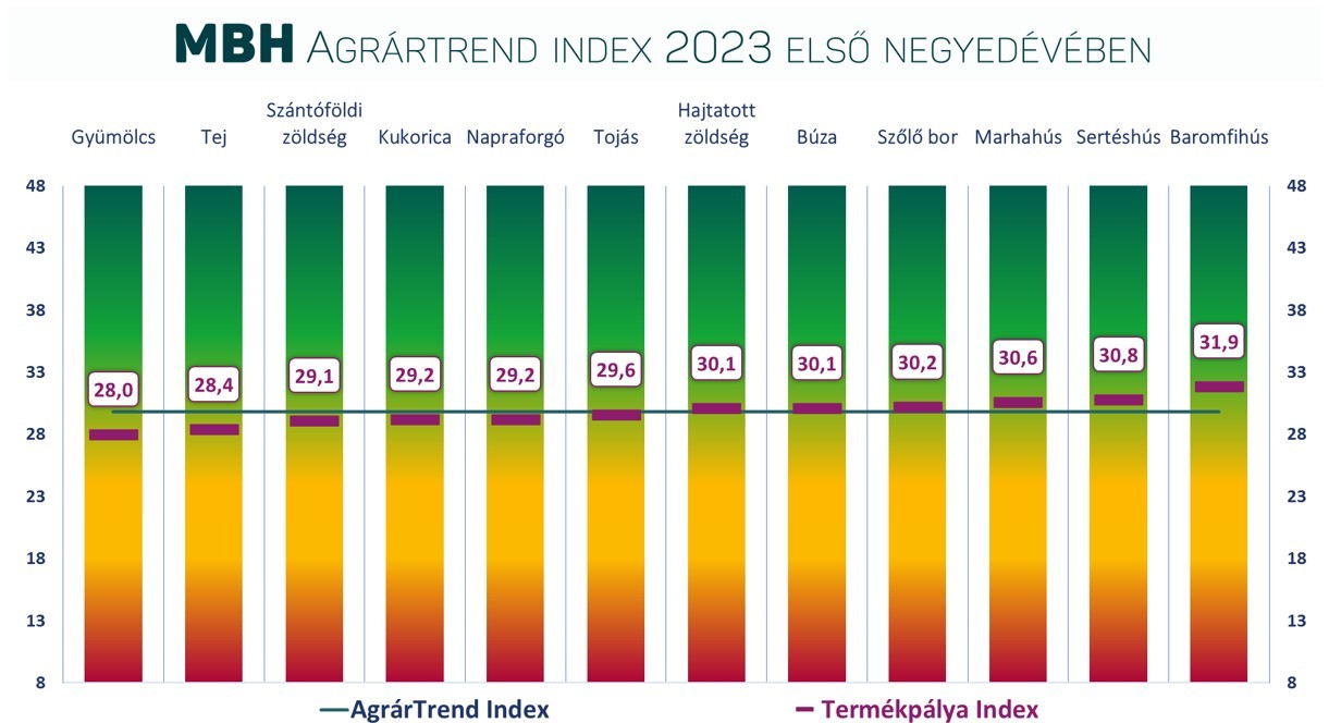 Az ügyfelek, szakmaközi szervezetek és a bank elemzőinek helyzetértékelése alapján készülő és a hivatalos statisztikákat megelőző agrár-élelmiszeripari bizalmi mutató, az MBH AgrárTrend Index értéke 2023 első negyedévében 29,8 pontra erősödött a 48 pontos skálán. A mostani érték a tavalyi utolsó negyedévhez képest 0,3 növekedést, éves összehasonlításban 0,3 pontos csökkenést jelent. A megelőző negyedévhez képest szinte minden alágazatban javultak a kilátások, de elsősorban az állati termékpályák pozíciója erősödött. És bár továbbra sincs olyan alágazat, amely elérné az egyensúlyi szintnek tekintett, 3-5 százalékos növekedési pályát és minden ponton stabil ár- és jövedelmi viszonyokat jelentő 35 pontot, egyes termékpályák egészen közel kerültek ehhez.