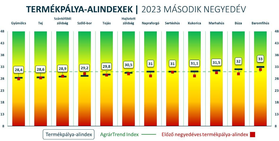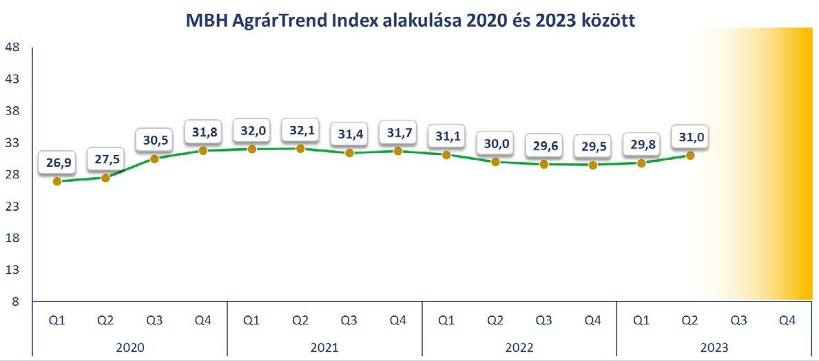Az MBH AgrárTrend Index értéke 2023 második három hónapjában 31 pontra erősödött a 48 pontos skálán. Legutóbb 2022 év elején állt hasonló szinten, amikor az orosz-ukrán háború következményeként fellépett élelmezésbiztonsági kockázatok, az energiaárak megugrása és az inputanyagok drasztikus drágulása éreztetni kezdte hatását.