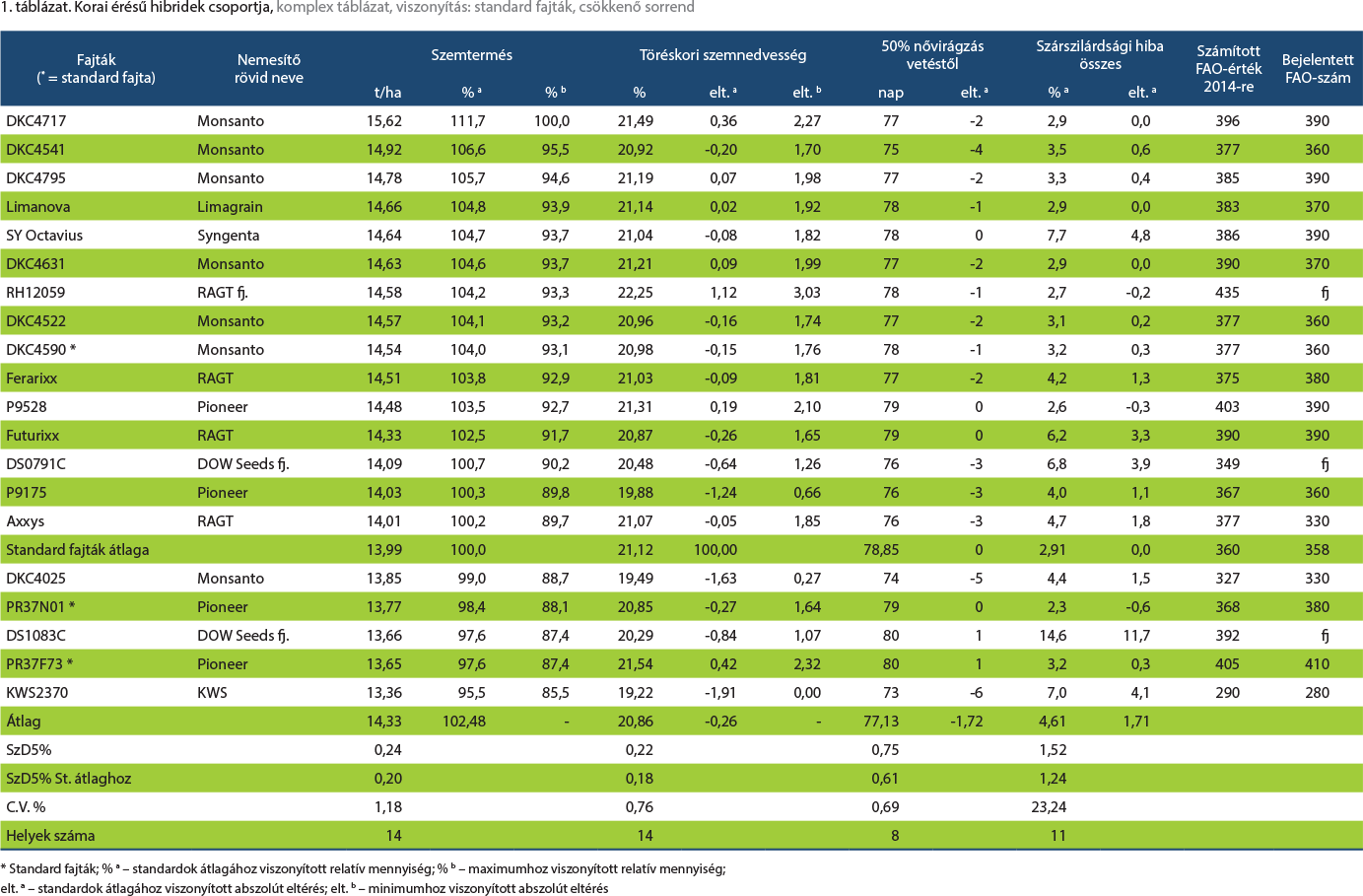 Korai csoport. A korai csoport termése minden évben jellemzően kisebb, mint a középérésűeké. A 4,6%-os különbség számottevő, de nem drámai. Azt is érdemes megjegyezni, hogy a korábbi években jelentős volt a „felhozatal” a mindkét csoporton belüli korábbi érésűekből, mára ez mindinkább eltolódik a csoporton belüli magasabb FAO értékek felé. A jelenség legvalószínűbb oka a termés-centrikus fajtaválasztás. Tényként említhető, hogy a korai csoport elejéhez tartozó, ám nagy terméspotenciállal rendelkező hibridek „kiöregedtek” és helyükbe nem léptek hasonló tulajdonságokkal rendelkező újabbak. A 2014. évi bejelentések során összesen 2 db FAO350-nél rövidebb tenyészidejű hibridet jelentettek be vizsgálatra (1. táblázat és 2. ábra). A relatív tenyészidő hosszabbodás következménye, hogy pl. búza előveteménynek biztonsággal választható hibridek köre elöregszik, leszűkül, s valós termésveszteséggel kell számolni a szakszerű vetésváltást alkalmazóknak. (A korai csoportban szereplő KWS2370 hibrid az igen korai csoporthoz tartozik, termőképességét és egyéb agrotechnikai tulajdonságait ehhez mérten kell figyelembe venni! Figyelemre méltó és pozitívan kell értékelni, hogy a csoportban kialakult egy vegyes genetikai összetételű, a 3. ábrán szintén jól szemléltetett „tömörülés”. Ez azt is jelenti, hogy a korai csoport tagjai közül választva a szélesebb genetikai háttér hozzájárul a környezeti kockázatok csökkentéséhez. A körültekintés szükségességének hangsúlyozására bemutatjuk a 2. ábrán a hibridek szereplését 2013-ban, egy közel 4 t/ha-ral kisebb kísérleti termésátlagú évben. (Csak a 2014-ben is szereplő hibridek nevei láthatók.)