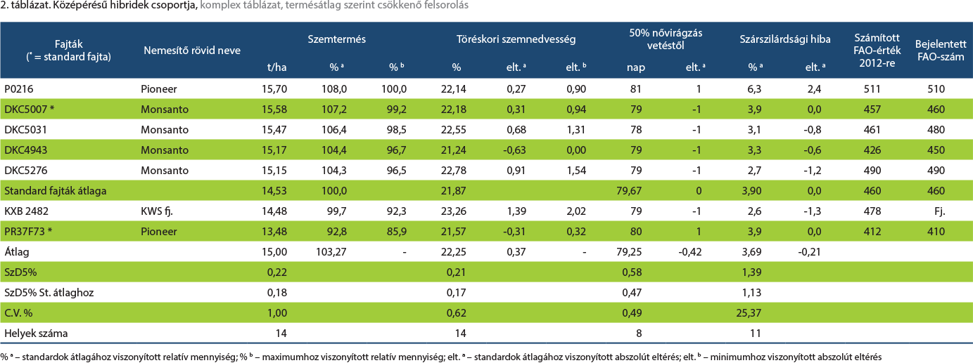 Középérésű csoport. A csapadékos nyár és a hosszú ősz kedvezett a hosszabb tenyészidejű hibrideknek abban, hogy „ki-ki tehetsége szerint” kiteljesítse termőképességét. Az egyértelmű terméselőnyt igazolja, hogy az átfutó sztenderd (PR37F73) termésátlaga gyakorlatilag megegyezett a két csoportban, lehetővé téve az összehasonlítást. A korai csoportban említett jelenség, amely szerint a nemesítők igyekeznek a csoportokon belül a későbbi hibridek forgalomba hozására, itt is igazolódik.