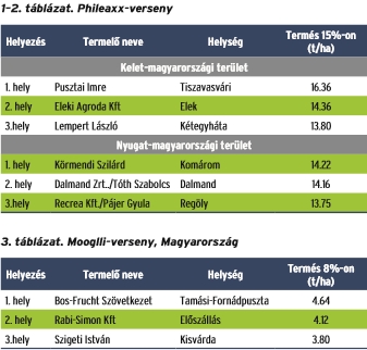 A Mooglli versenybe 21 gazdaság nevezett be, melyből 14 ellenőrzött betakarítású eredmény érkezett a versenybizottsághoz. Az összes eredmény termésátlaga 8%-os szemnedvesség-tartalomra korrigálva 3,33 t/ha, amely összesen 495 ha területet reprezentál. A verseny győztesei a 3. táblázatban szerepelnek: