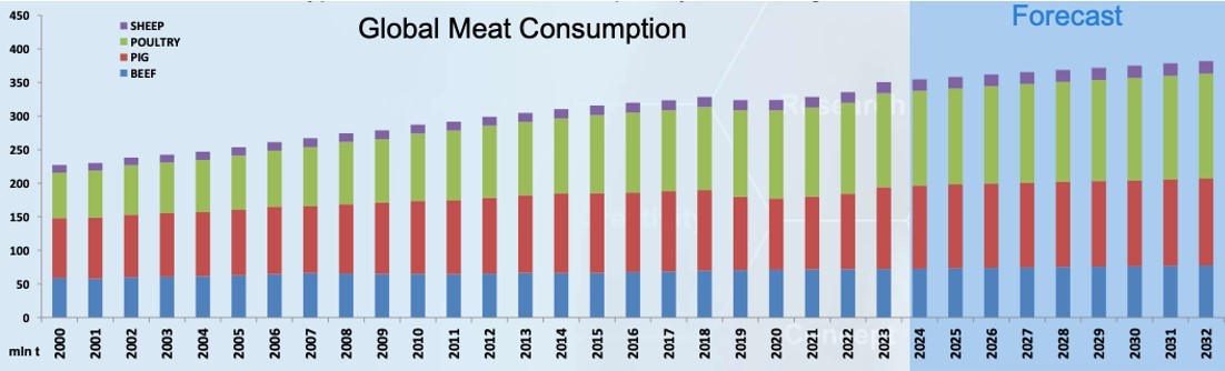 A világ húsfogyasztása folyamatosan növekszik A hústermelés csaknem ötszöröse az 1960-as évek eleji értéknek, és 2023-ban a globális húsfogyasztás elérte a 345 millió tonnát. Becslések szerint egy évtizeden belül a hústermelés eléri a 381 millió tonnát. 2019-től a legtöbbet fogyasztott húsfajta a baromfihús lett, átvéve ezzel a vezető szerepet a sertéshústól.