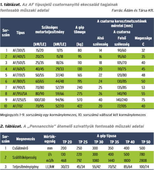 A telepíthető traktoros átemelő szivattyúk is különböző nagyságrendben, vagyis szállítóképességgel, nyomócsőátmérővel és teljesítményigénnyel rendelkeznek az eltérő felhasználói igények mellett, példaként a 2. táblázatban foglaltuk össze a Pennancchio átemelő szivattyúk említett műszaki adatait.