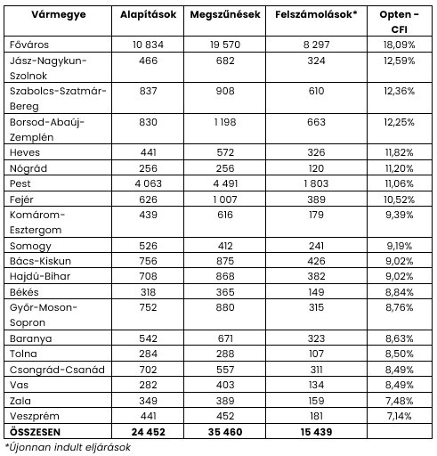 Az Opten – Cégfluktuációs Index (CFI – az adott időszak alatt törölt, és alapított cégek számát viszonyítja az időszak elején rendben működőkhöz képest) 2024-re vonatkozó értéke országosan 12,93 százalék volt, mely 0,76 százalékkal alacsonyabb a 2023-as CFI értéknél. 2024-ben megyei szinten nézve az Opten–CFI Veszprém, Vas és Zala vármegyékben érte el a legalacsonyabb értékeket, míg a legmagasabb fluktuációt Budapest, Jász-Nagykun-Szolnok és Szabolcs-Szatmár-Bereg vármegye produkálta.