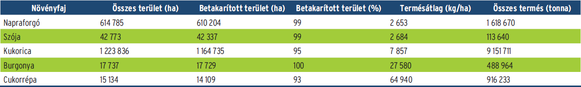 A terméseredményekkel kapcsolatban elmondható, hogy kukoricából 1,184 millió hektárról 7,86 t/ha-os országos termésátlaggal összesen mintegy 9,3 millió tonna termés kerülhetett a raktárakba, míg napraforgó esetében a 610 ezer hektáros betakarított területről 2,65 t/ha-os országos termésátlag mellett 1,6 millió tonnás termés került betakarításra. Az említett adatok a Nemzeti Agrárgazdasági Kamara felmérésein alapulnak (1. táblázat).