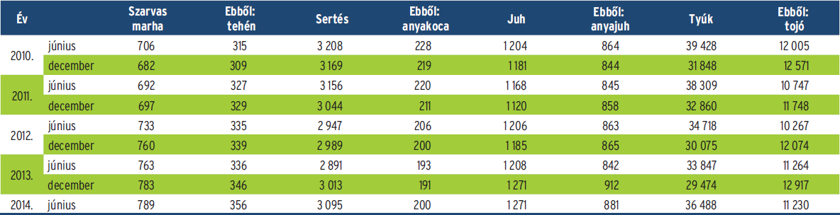 – A Kormány agrárpolitikájában központi szerepet kapott az állattenyésztés fejlesztése. Az elmúlt évek célzott intézkedései egyre inkább kifejtik kedvező hatásukat. A KSH 2014. június 1-jei állapotot tükröző adatai szerint minden fontosabb állatfaj esetében kedvező folyamatok figyelhetők meg, nőtt a szarvasmarha-, sertés-, juh- és tyúkállomány is (3. táblázat). Különösen pozitív tény, hogy a sertésállomány évtizedes hanyatlását sikerült megfordítani. Ugyanakkor az ágazat sajátosságai miatt az eredmények nagy része hosszabb időtávon jelentkezik, ezért a jövőben az állomány további növekedése várható. A tendenciák azonban rendkívül érzékenyek a piaci helyzet és a támogatások jövőbeli alakulására.