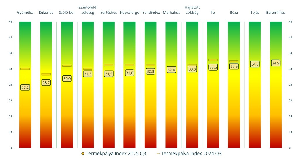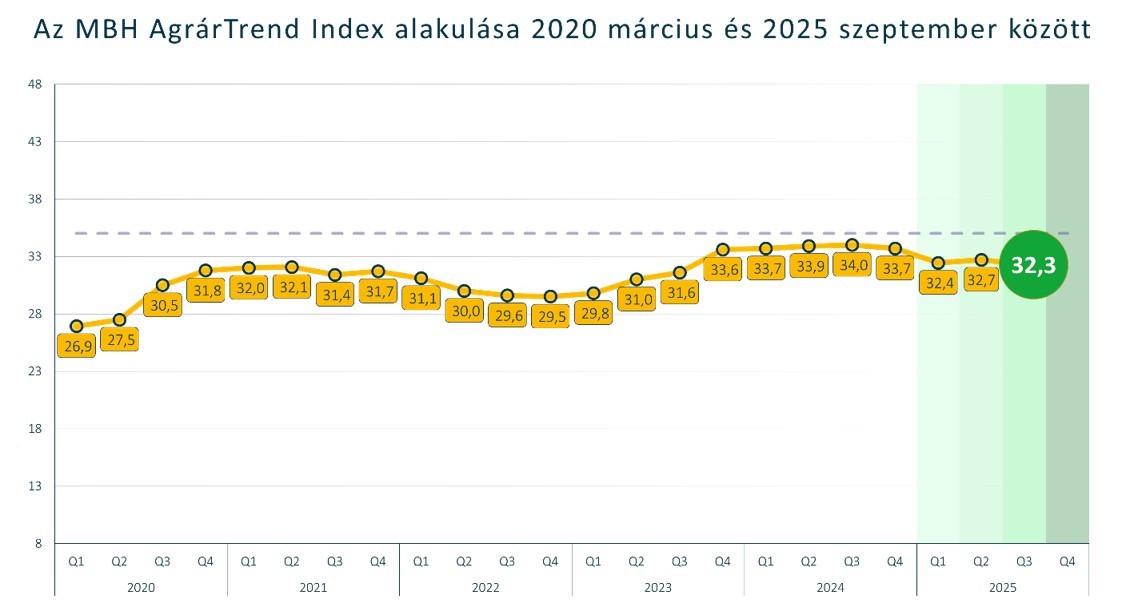 Az ügyfelek, szakmaközi szervezetek és a bank elemzőinek helyzetértékelése alapján készülő, és a hivatalos statisztikákat megelőző agrár-élelmiszeripari bizalmi mutató, az MBH AgrárTrend Index értéke 2025. szeptember végével 32,4 pontot mutatott a 48 pontos skálán, ezzel kismértékben távolodott az egyensúlyi szintnek tekintett 35 ponttól: az előző negyedévi 0,3 pontos emelkedést 0,4 pontos csökkenés követte július és szeptember között. Éves összevetésben ennél nagyobb mértékű, 1,9 pontos csökkenés tapasztalható az indexben, amely így most a 2023 végi, 2024 eleji agrárgazdasági pillanatképhez hasonló értékelést mutat.