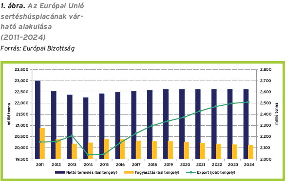 Az Európai Bizottság középtávú projekciója szerint a sertéshústermelés lassú, de folyamatos növekedése várható 2020-ig, majd a termelés stagnálása jellemezheti az uniós sertéspiacot 2024-ig (1. ábra). Az előrevetítés szerint a kibocsátás 22,6 millió tonna körül alakulhat 2024-ben, ami 1 százalékkal haladná meg a 2013. évi mennyiséget. Az EU sertéshúsexportjának jelentős emelkedése az idei évben még nem várható, ugyanakkor 2024-re az export csaknem 14 százalékos növekedését várják a 2013. évihez képest. A sertéshúsimport 17 ezer tonna körül alakulhat az idén. Ezt követően évente 21 ezer tonna sertéshús behozatalára számítanak a szakértők. Az EU sertéshús-fogyasztása előreláthatóan csökken a következő tíz évben. A fogyasztás a régi tagországokban mérséklődik, míg az EU-13-ban növekedést jeleznek.