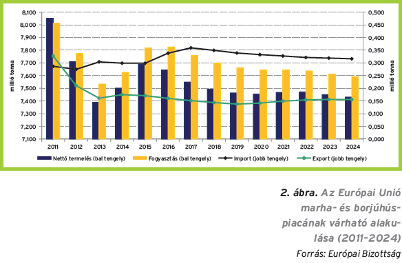Az Európai Bizottság projekciója szerint az EU marhahústermelése 7,43 millió tonna körül alakulhat 2024-ben, ami 0,5 százalékkal haladná meg a 2013. évi mennyiséget (2. ábra).