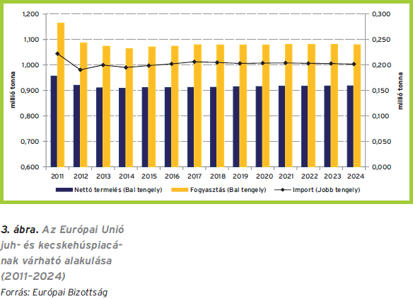 Az Európai Bizottság középtávú előrevetítése alapján az EU juh- és kecskehústermelése a következő tíz évben folyamatosan növekedni fog, és 918 ezer tonna körül várható 2024-ben, ez 1 százalékkal lenne több, mint a 2013. évi mennyiség (3. ábra). A Közösség juh- és kecskehúsimportja 206 ezer tonnára emelkedhet 2017-re, azonban 202 ezer tonnára csökkenhet a vizsgált időszak végére. Új-Zéland és Ausztrália várhatóan nem fogják kihasználni a rendelkezésükre álló importkvótát a következő időszakban, mert az ázsiai piac kereslete egyre nagyobb lesz a két országból származó bárányhús iránt. A régi tagországokban a juh- és a kecskehús fogyasztásának 1 százalékos csökkenése várható 2024-re 2013-hoz képest. Az új tagországokban 2019-ig emelkedhet a fogyasztás, ezt követően mérséklődhet.