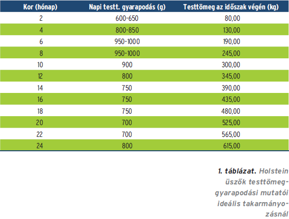 Az intenzív felnevelés esetén a fajta egyedeitől elvárható testtömeg gyarapodási mutatókat az 1. táblázat tartalmazza: