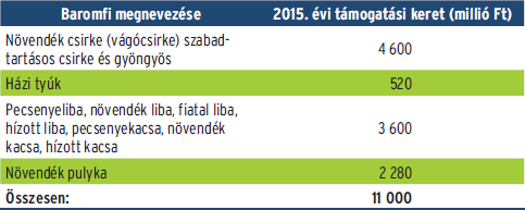 Összességében tehát azt mondhatjuk, hogy a baromfiágazat támogatására a 2015. évben mintegy 15 Mrd Ft összeget biztosít a kormányzat. A forrásösszeg szinte kizárólag nemzeti forrásból lesz biztosítva.