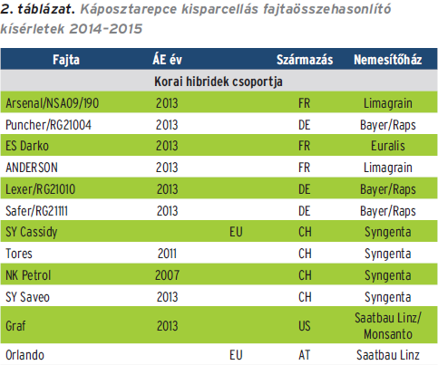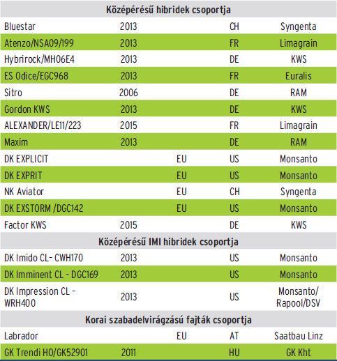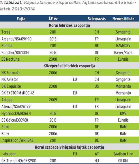 A NÉBIH a nemesítőházak megbízása alapján 2014–2015. évi tenyészidőszakban korai éréscsoportban 2 fajtát és 12 hibridet, a középérésű csoportban 13 hibridet vetett el 12 termőhelyen. A 2014–2015 évi tenyészidőszakban első alkalommal már vizsgálunk 3 középérésű csoportba tartozó, imazamox hatóanyagra rezisztens hibridet ebben a kísérlet típusban.