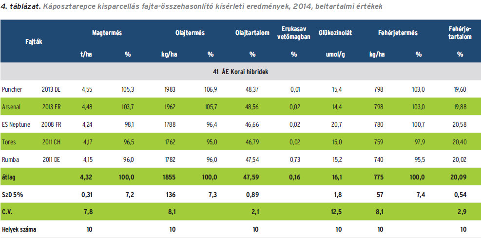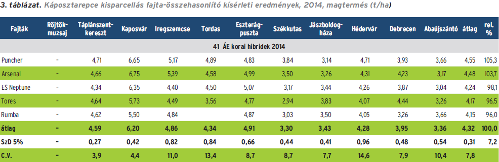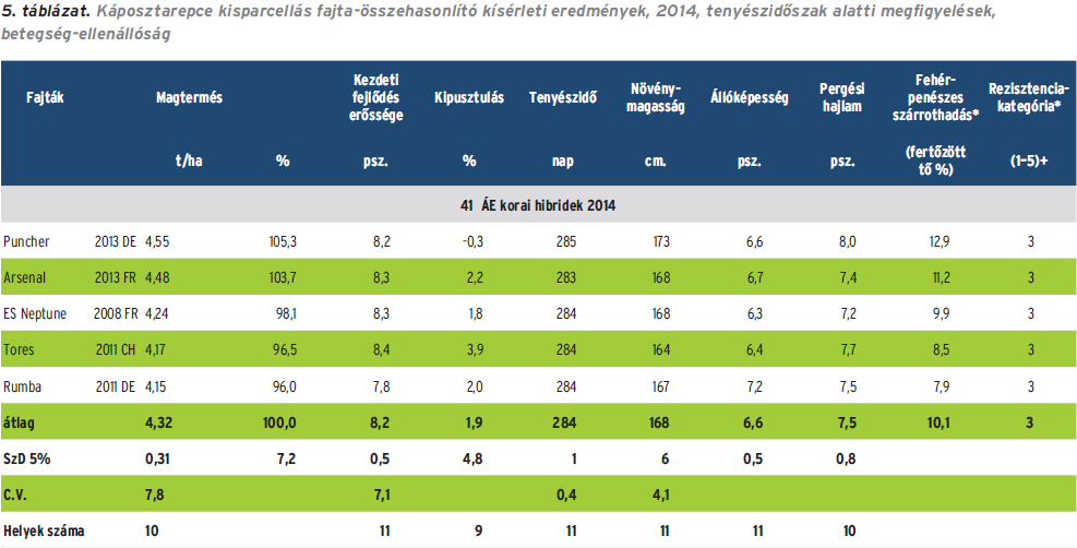 Termőhelyenként a terméseredményeket a 3. táblázat tartalmazza. Összevontan közöltük a beltartalmi eredményeket (4. táblázat) és a tenyészidőszak alatti megfigyelések eredményét (5. táblázat). A kórtani adatokat ugyancsak a 5. táblázatban tanulmányozhatják. A Nemzeti Fajtajegyzéken jelenleg 157 őszi káposztarepce fajta szerepel, ami megfelelő genetikai bázist biztosít a repcetermesztéshez.