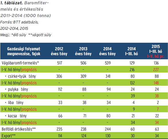 A baromfihús szektor negyedéves eredményeit a legutóbbi 3 teljes év és a múlt év azonos időszakával összehasonlításban tartalmazza az 1. táblázat. Mint már arra korábban is utaltunk, a vágóbaromfi-termelés számai egy programokkal kiegészített számítási módszerrel ún. előrejelzés (prognózis) segítségével 5 teljes hónapra belátható helyzetet tükröznek (lásd a pirossal írt adatokat). A várható vágásokhoz az alapanyagadatok május végéig tételesen rendelkezésre állnak.