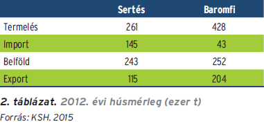 Összehasonlításként közöljük a KSH húsmérleg adatait (sajnos a legfrissebb 2012-ből való, de az arányok ma is nagyon hasonlóak)(2. táblázat).
