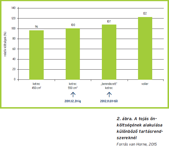 Látható, hogy az EU szabályozása következtében a „berendezett” ketrecben a tojás önköltsége 7%-kal nőtt (a táblázatban a hagyományos 550 cm2/tojó állománysűrűségű ketrec költségét tekintjük 100-nak).