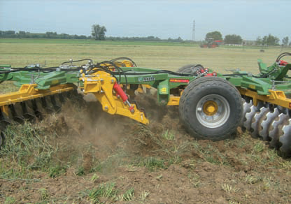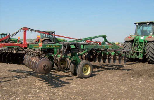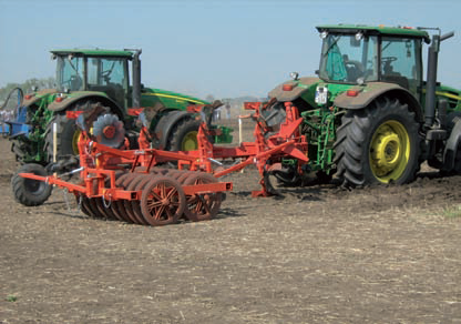 A talajszerkezet vízháztartásának javítását a forgatásnál kialakult talajművelési technológia alkalmazása is elősegíti. A forgatás nélküli alapművelés eszközei a több munkaműveletet összekapcsoló kombinált munkaeszközök, lazítós tárcsák (9. ábra). A lazítós tárcsák erős vázkeretre épített, „V” alakban elhelyezett tárcsatagokból, ezt követően pedig két sorban osztottan, vagy szintén „V” alakban elhelyezett lazítószerszámokból állnak. A lazítós tárcsák alkalmazásával a lazítási és tárcsázási munkák összekapcsolhatók, ami energia- és munkaidő-megtakarítással is jár. A lazítós tárcsák használata során a tárcsatagok levelei elvégzik a szármaradványok aprítását, valamint bekeverését. A különböző munkaeszközzel felszerelhető lazítószerszámok pedig a talajszelvényt felemelik, fellazítják a csapadék befogadásának optimális feltételeket biztosítva. A tárcsás lazítókra szerelt pálcás hengerek pedig elvégzik a talaj lezárását. A tárcsás lazítók használatával éppen az őszi csapadékos időszakban lekerülő elővetemény után rendelkezésre álló rövid, a talajművelésre alkalmas időszakok használhatók ki. Ugyanezen szempontok szerint a nedvesség megőrzése miatt a korábban ismertetett mulcskultivátorok használata jelent előnyt abból a szempontból, hogy ezekkel – kedvező körülmények között – a magágy egy menetben is elvégezhető (10. ábra). A kombinált munkaeszközök, a tárcsás lazítók, mulcskultivátorok használatát az is indokolja, hogy az őszi káposztarepce, illetve az őszi kalászosok nem feltétlenül igénylik a forgatásos alapművelést, vagyis a szántást.