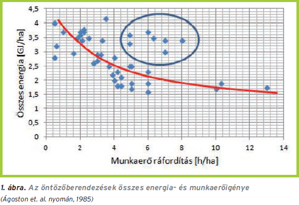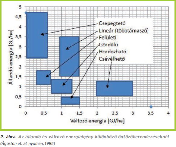 Az öntözéstechnika dinamikus fejlődésének időszakában végzett vizsgálatok megmutatták az alapvető összefüggéseket az öntözés energetikai megítélésére vonatkozóan. Az 1. ábra az öntözés fajlagos (1 hektárra vonatkoztatott) összes energia- és munkaerőigényét szemlélteti. A diagramban minden pont egy-egy konkrét öntözőberendezésre vonatkozik. Jól látható, hogy a vizsgált gépek zöme viszonylag kis összes energiát és munkaerő-ráfordítást igényelt, az illesztett görbe pedig az összes energia- és a munkaerő-ráfordítás fordított arányát mutatja. Kivétel a stabil öntözőberendezések csoportja (bekarikázott pontok), ahol a beruházás magas aránya növeli meg az összes energiaigényeket.