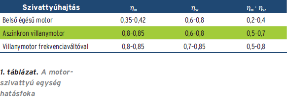 A motor-szivattyú egység hatásfoka nagymértékben függ a már említett energetikai összhangtól és az aktuális üzemeltetési paraméterektől. Az 1. táblázat tájékoztató jelleggel tartalmazza a részhatásfokokat és az eredő hatásfokot is.