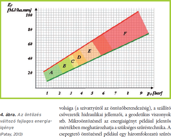 A C–D mezőbe sorolható be a kis intenzitású szórófejekkel (i < 5 mm/h) végrehajtott esőztető öntözés, a közepes intenzitású esőztető öntözés (i = 5 – 15 mm/h) a D–E mezőbe esik. A legnagyobb energiaigénye a nagy intenzitású szórófejekkel (i > 15 mm/h) szerelt esőztető öntözőberendezéseknek van (F mező).