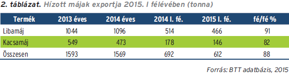 A kacsa exportja a múlt évi trendeknek megfelelően alakul, ez a csirke mellett a másik sikerágazat, s mint fentebb említettük, a sült kacsatermékek piaci kereslete élénkülésének és a gyártás több vállalatnál történő beindulásának, illetve bővülésének nagy mértékben köszönhető.