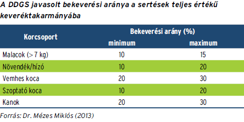„A DDGS hízóbikáknak javasolt mennyisége a napi adag szárazanyag- tartalmára számítva maximum 20%. Lovaknál csak kevés adat áll rendelkezésre és nagyon eltérő mennyiséget javasolnak (3–15%), hasonlóképpen eltérő mennyiségben (5–25%) javasolják alkalmazni baromfifajoknál is. Ezen belül brojlercsirkékkel aggálymentesen etethető akár 18% mennyiségben, és tojótyúkoknál sem rontotta a termelési paramétereket 15–16% mennyiségben alkalmazva. Mennyisége leginkább a pulykahizlalás során növelhető a takarmányban, akár 25%-ra is.”