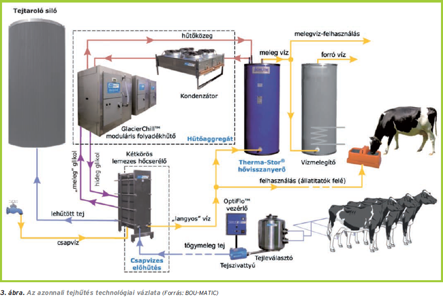 Azonnali (direkt) tejhűtés. A fejőházból a tőgymeleg tejeet a tejleválasztó után a tejszivattyú a tejszűrőn, majd a vizes és egy hűtőfolyadékos (glykolos) hőcserélőn át a tejtároló tartályba szállítja (lásd 3. ábrát). A csapvizes, lemezes hőcserélő a tejet kb. 23–25 °C hőmérsékletre, a hűtőfolyadékos (glykol) lemezes hőcserélő pedig 4 °C-ra hűti le. Ennek a tejhűtési technológiának ott van jelentősége, ahol nagy létszámú a fejt tehénállomány és nagy mennyiségű tejet kell lehűteni rövid idő alatt. A rendszert 2000 liter/óra feletti fejt tejmennyiség esetén érdemes alkalmazni, amikor a tejmennyiség már akkora, hogy a tartályhűtés képtelen lenne a szabvány által előírt időn belül lehűteni azt. A lehűtött tej tárolása tejtároló silókban történik, vagy közvetlenül a tejszállító tartályba kerülhet.