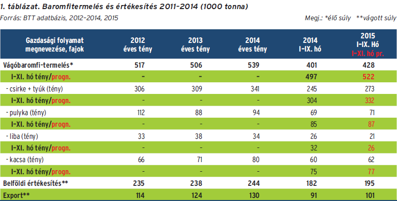 A baromfihús szektor 2015. I. féléves eredményeit a legutóbbi 3 teljes év és a múlt év azonos időszakával összehasonlításban tartalmazza az 1. táblázat. Mint már arra korábban is utaltunk, a vágóbaromfi-termelés számai egy programokkal kiegészített számítási módszerrel, ún. előrejelzés (prognózis) segítségével az év végéhez már egészen közeli, belátható helyzetet tükröznek (lásd a pirossal írt adatokat). A várható vágásokhoz az alapanyagadatok november végéig tételesen rendelkezésre állnak.