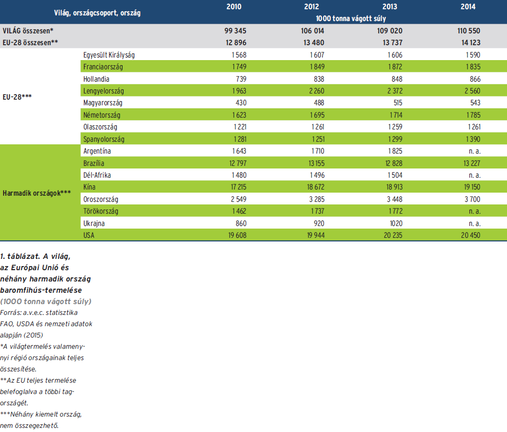 Az 1. táblázatban a baromfihús-termelés 2010 és 2014 közötti alakulását mutatjuk be a világ, az EU néhány baromfitermelésben meghatározó országa, ugyanígy a harmadik (EU-n kívüli) országok viszonylatában.