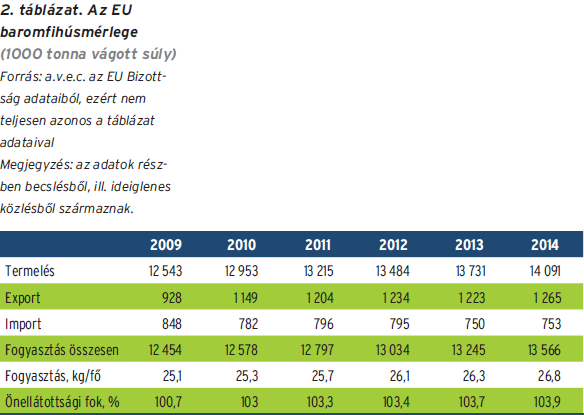 Az európai szövetség összeállította az Unió baromfihúsmérlegét (2. táblázat), amely nyugodt, egyenletes termelési és felhasználási adatokat tükröz, valószínűleg a középtávú trendek alakulását is sejtteti.