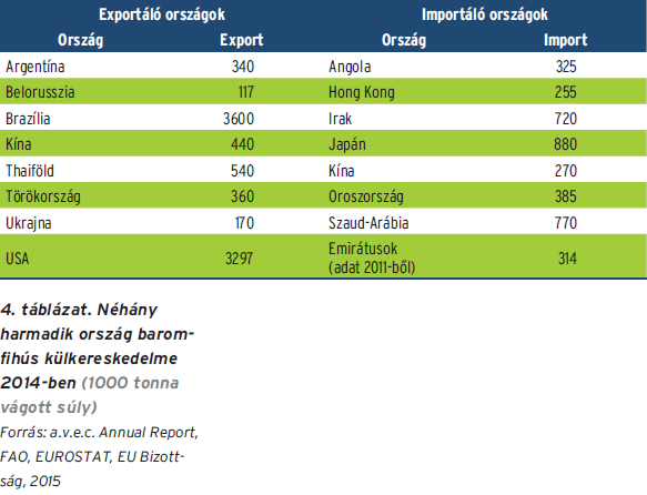 A harmadik országok baromfihús-külkereskedelmét a jellemzően exportáló, illetve importáló országaiból összeállított 4. táblázatban mutatjuk be. A világon megtermelt baromfihúsnak általában 10–11%-a kerül a nemzetközi forgalomba. A táblázatban látható, hogy Brazília és az USA abszolút uralja a világ exportpiacait, de mellettük feljövőben van Argentína, Kína (amely még jelentős importőr is), Törökország, Thaiföld (amely már évtizedek óta a főbb exportőrök közé tartozik). Az importőrök között Oroszország szerepe a már említett hazai termelésnövelés miatt egyre kisebb lesz.
