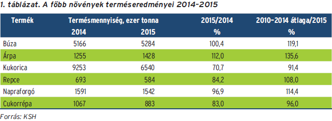 A növényi termékek körében a kertészeti termékek kivételével minden termékcsoport mennyisége csökkent 2015-ben. A gabonafélék, az ipari növények, a burgonya és a gyümölcsfélék mennyisége rendre elmaradt az előző évitől. A gabonafélék volumene az előzetes adatok szerint 13,5 százalékkal lett kisebb, elsősorban azért, mert kukoricából mindössze 6,5 millió tonna várható, 30 százalékkal kevesebb a 2014. évinél. Ugyanakkor a 2015. évi termés csak 9 százalékkal marad el az előző öt év, azaz a 2010–2014. évek átlagától. Például a 2015. évinél sokkal kisebb volt a kukoricatermés 2012-ben, amikor csak 4,8 millió tonna, a múlt évi mennyiség kétharmada termett. A kalászos gabonafélék terméseredményei viszont jobbak voltak a 2014. évinél, egyedül a zab mennyisége maradt el az egy évvel korábbitól. Búzából, durumbúzával együtt 5,3 millió tonnát takarítottak be, ami csak 0,4 százalékkal több a 2014. évinél, de az elmúlt öt év átlagánál 19 százalékkal magasabb. A 2015. évi búzatermés a 2000-es évek harmadik legjobb eredménye, 2004-ben 6,0 millió tonna, illetve 2008-ban 5,6 millió tonna volt. Az árpa, a rozs, a tritikálé mennyisége 12, 7, illetve 5 százalékkal meghaladta a 2014. évit. A napraforgó termésmennyisége 3 százalékkal kevesebb az előző évinél, de 15 százalékkal meghaladja az ötéves átlagot (1. táblázat).