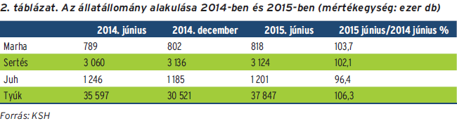 Az előrejelzés alapján az élő állatok és állati termékek termelésének volumene 6 százalékkal emelkedett, kibocsátásának értéke azonban csak a támogatások révén haladta meg 3 százalékkal a 2014. évi szintet, mert a termelői árak nagyrészt elmaradtak az előző évitől. Volumennövekedés a marha-, a sertés- és a baromfiágazatban mutatkozik, a juh kibocsátásának volumene azonban elmaradt az előző évitől (2. táblázat). A termelői ár a tej esetében csökkent a legnagyobb mértékben, 21 százalékkal, de a sertés felvásárlási ára is 10 százalékkal alacsonyabb volt, mint 2014-ben.